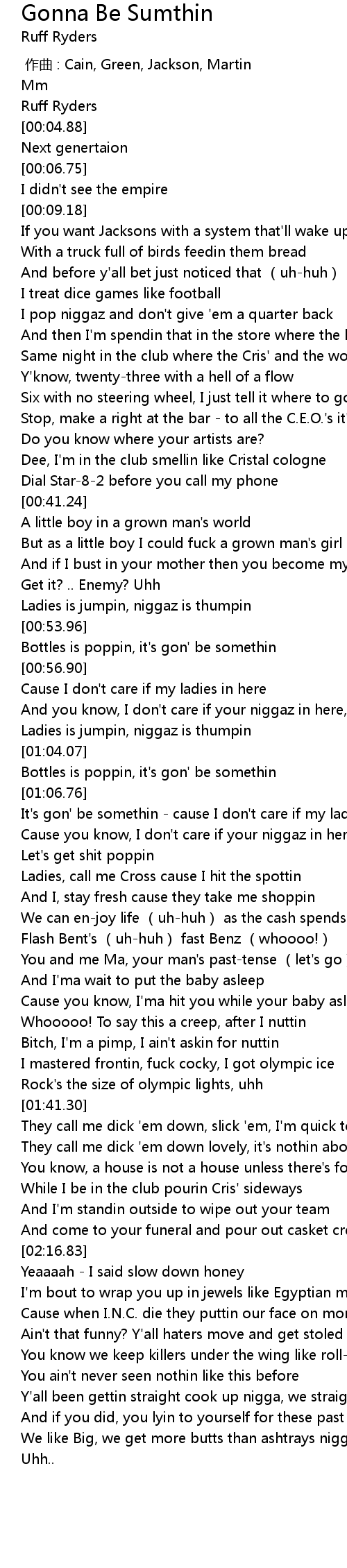 | [00:52.22] | Ladies is jumpin, niggaz is thumpin |