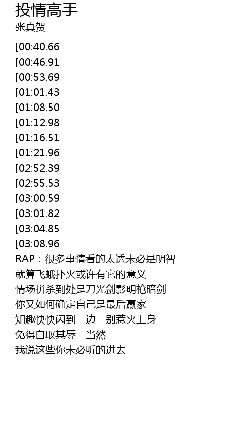 | [01:53.60] | 情场拼杀到处是刀光剑影明枪暗剑 |