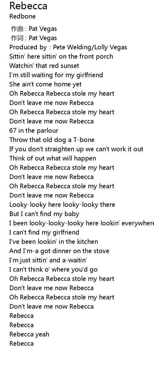 | [02:22.38] | Oh Rebecca Rebecca stole my heart |