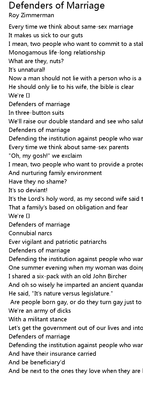 | [Spoken] Are people born gay, or do they turn gay just to piss off Dick Armey? | |