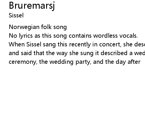 | When Sissel sang this recently in concert, she described it as a wedding march and said that the way she sung it described a wedding in three parts: the ceremony, the wedding party, and the day after |