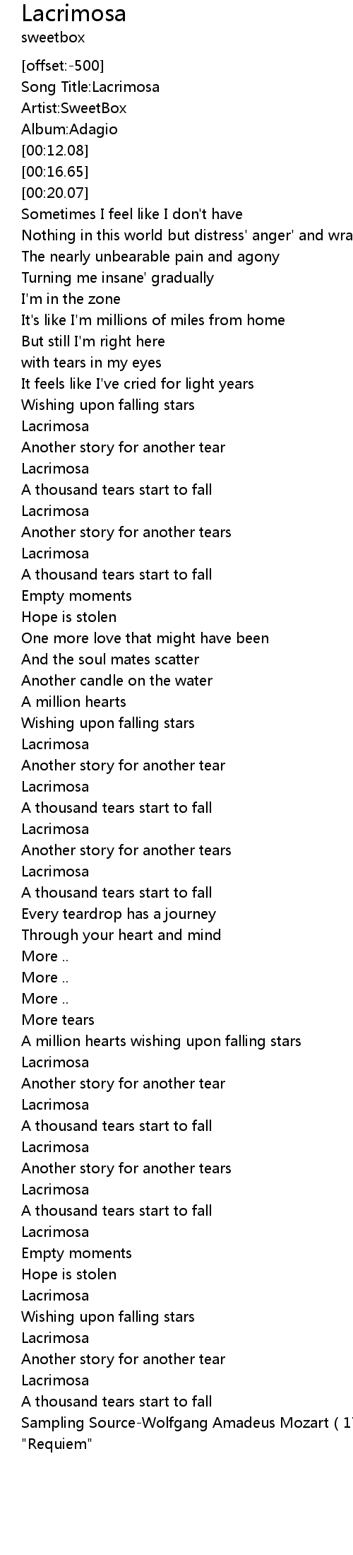| [02:53.84] | Sampling SourceWolfgang Amadeus Mozart 17561791' " Lacrimosa" in " Requiem" |