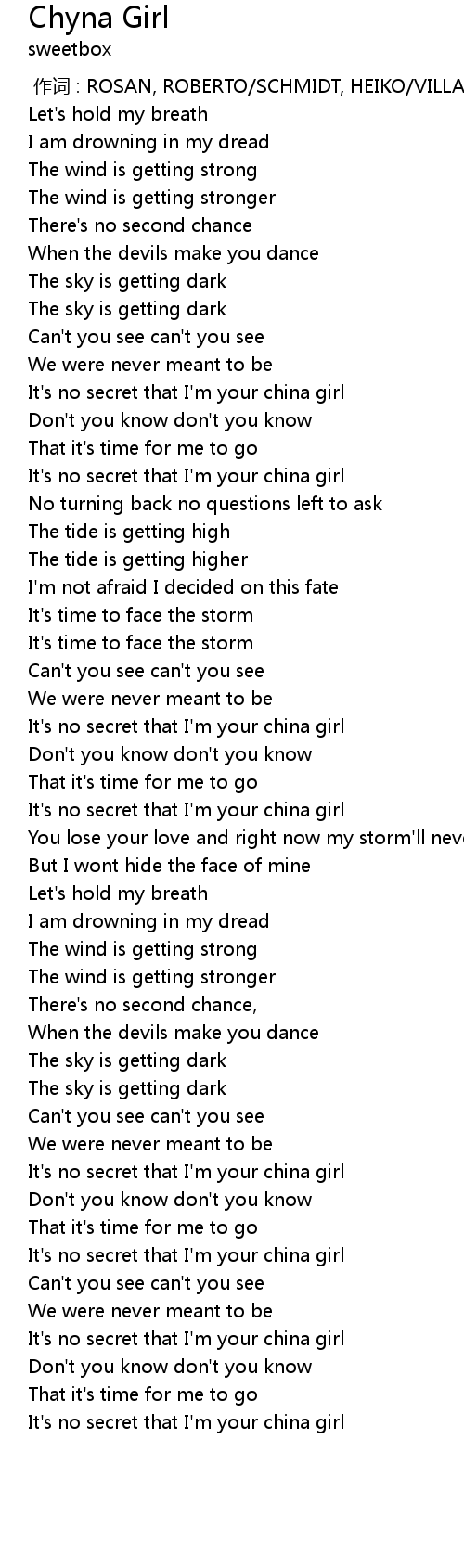 | [02:57.939] | It's no secret that I'm your china girl |