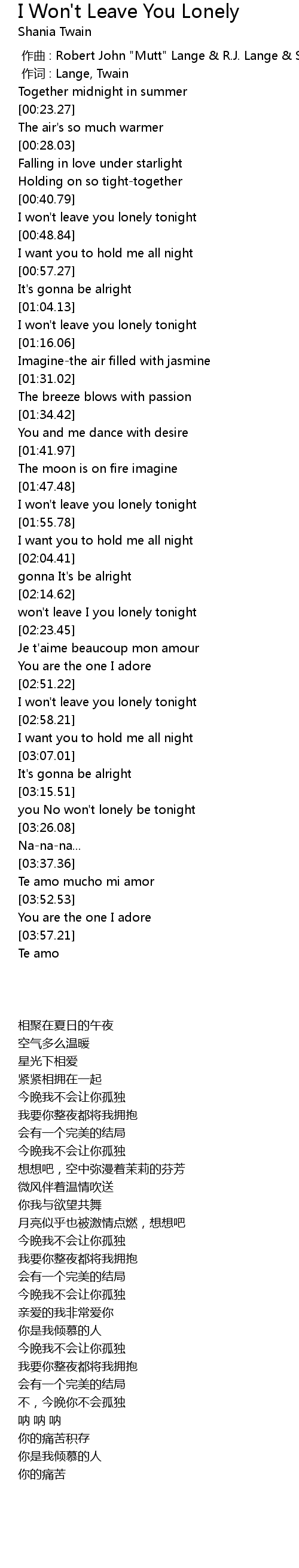 | [00:01.00] | 作词 : Lange, Twain |