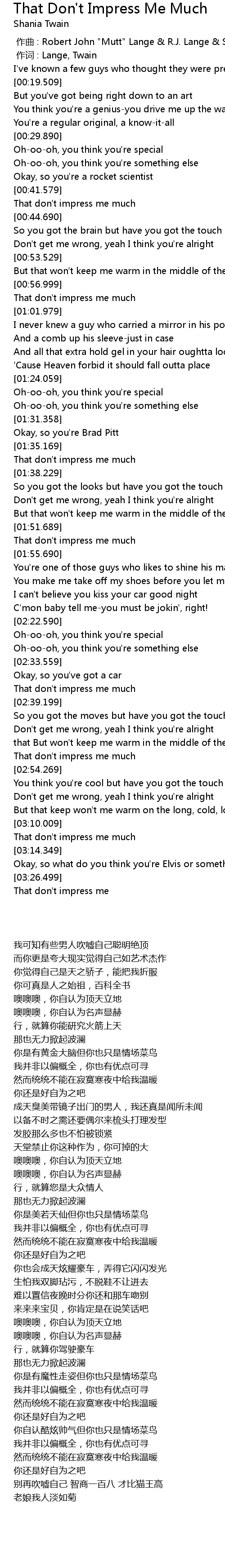 | [00:00.00] | 作曲 : Robert John "Mutt" Lange & R.J. Lange & Shania Twain |