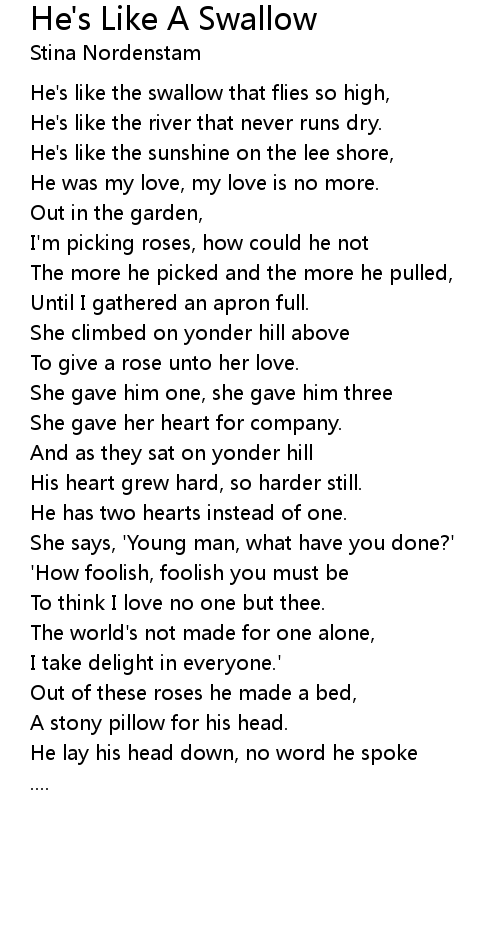 He's like the swallow that flies so high, |