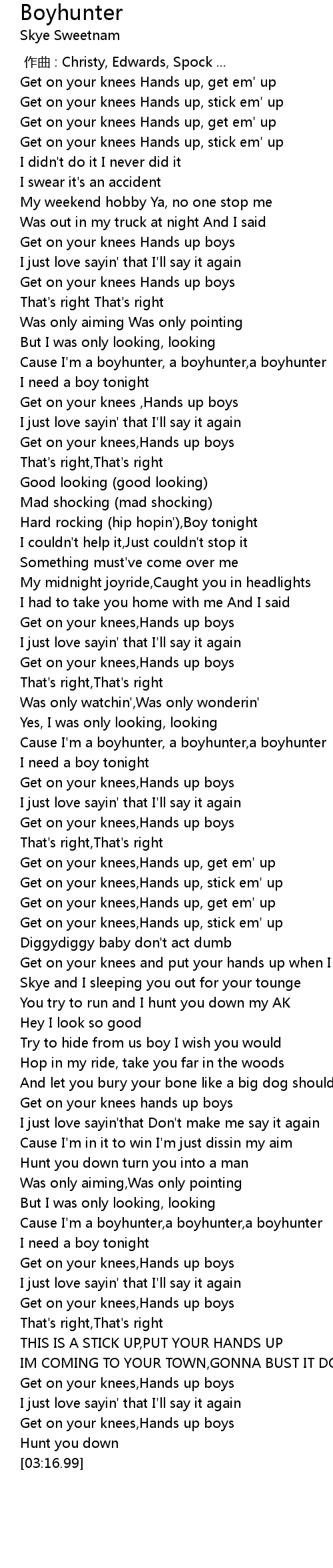 | [03:12.97] | Get on your knees,Hands up boys |