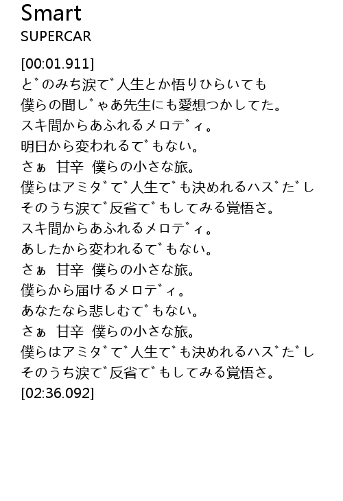 | [01:29.264] | さぁ 甘辛 僕らの小さな旅。 |