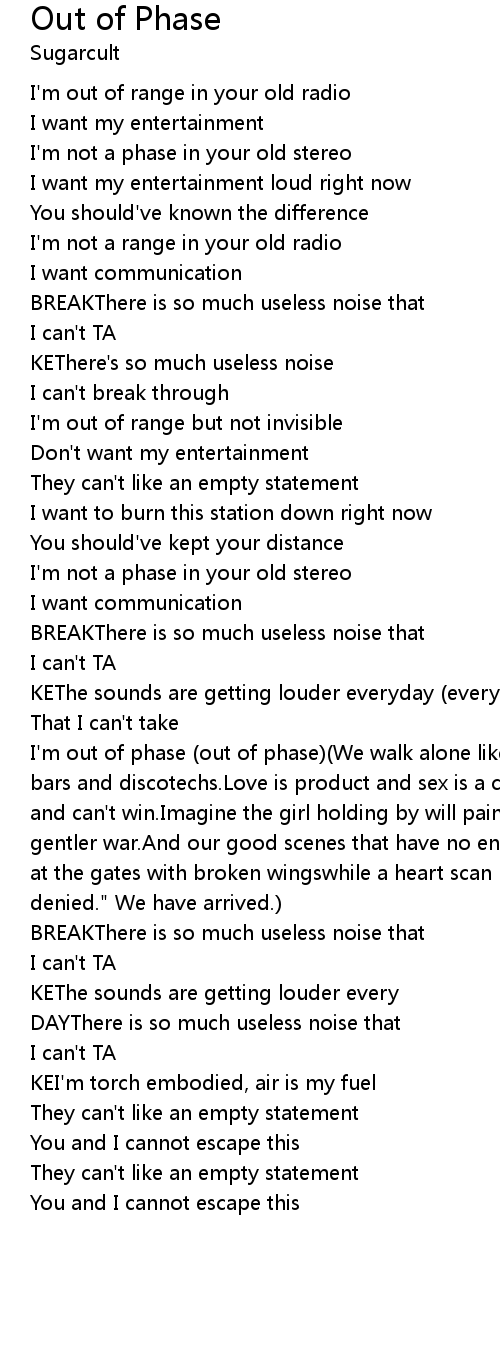 I'm out of phase (out of phase)(We walk alone like broken motorists. Behind the bars and discotechs.Love is product and sex is a currency. We're all cheaters and can't win.Imagine the girl holding by will paint a picture of a kinder, gentler war.And our good scenes that have no ending.One that leaves us standing at the gates with broken wingswhile a heart scan reports "access denied, access denied." We have arrived.) |