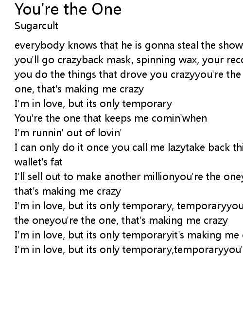 everybody knows that he is gonna steal the showyou better keep it in control or you'll go crazyback mask, spinning wax, your record had a heart attackit made you do the things that drove you crazyyou're the oneyou're the oneyou're the one, that's making me crazy |
