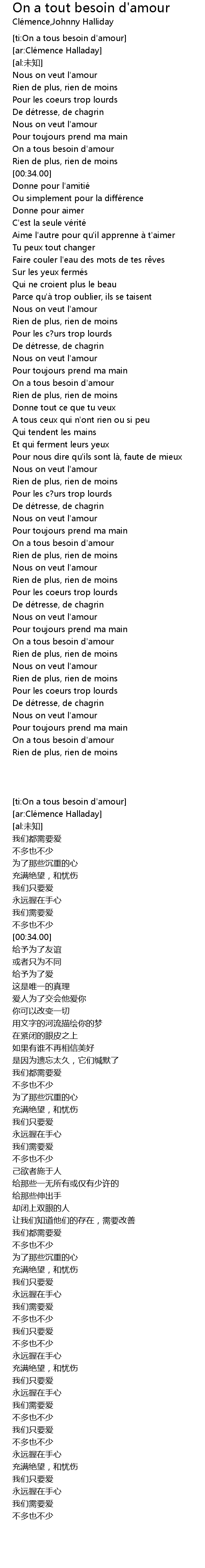 | [01:01.85] | Aime l' autre pour qu' il apprenne a t' aimer |