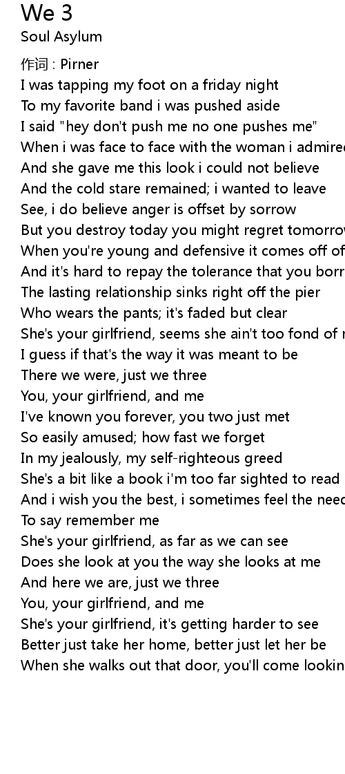 | She' s your girlfriend, seems she ain' t too fond of me | |