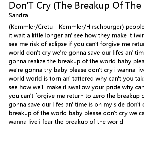 (Kemmler/Cretu - Kemmler/Hirschburger) people crowd together why don't you take it wait a little longer an' see how they make it twinin' with time why can't you see me risk of eclipse if you can't forgive me return to zero the breakup of the world don't cry we're gonna save our lifes an' time is on my side don't cry i'm gonna realize the breakup of the world baby please don't cry we can forgive we're gonna try baby please don't cry i wanna live i fear the breakup of the world world is torn an' tattered why can't you take it hope a little longer an' see how we'll make it swallow your pride why can't you see me risk of eclipse if you can't forgive me return to zero the breakup of the world don't cry we're gonna save our lifes an' time is on my side don't cry i'm gonna realize the breakup of the world baby please don't cry we can forgive we're gonna try i wanna live i fear the breakup of the world |