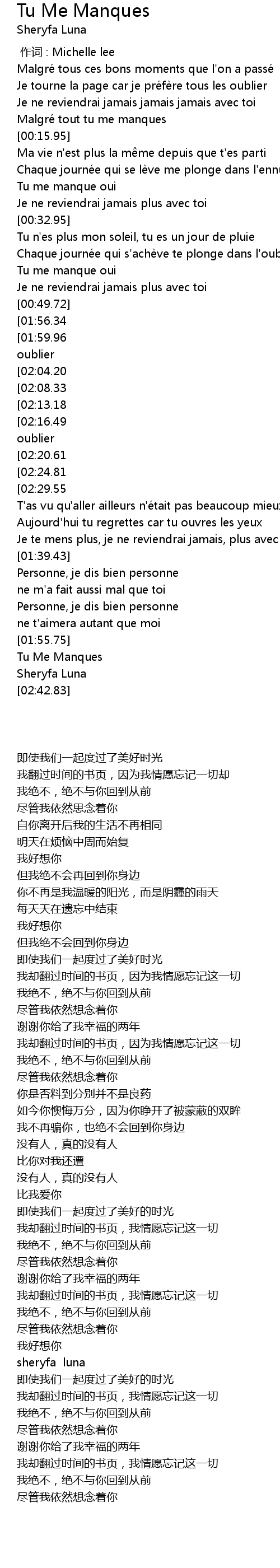 | [02:57.85][02:08.33][01:02.13] | Malgre tout tu me manques |
