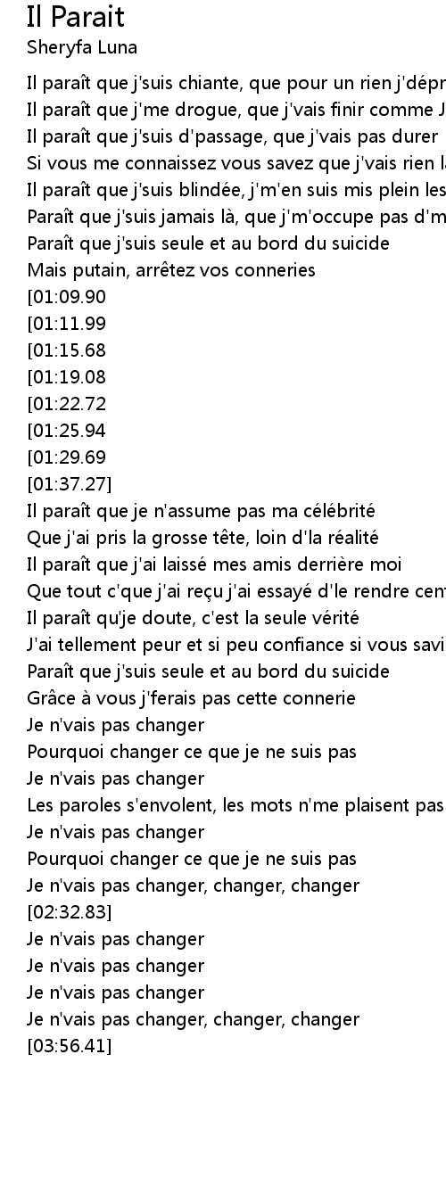 | [00:42.32] | Il paraît que j'suis chiante, que pour un rien j'déprime |