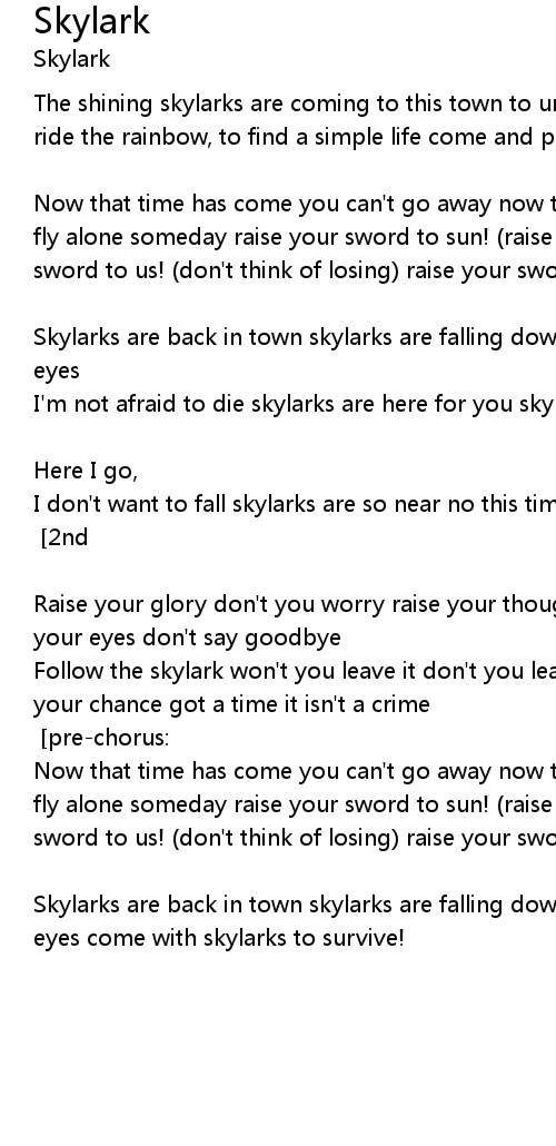 The shining skylarks are coming to this town to understand what people desire to ride the rainbow, to find a simple life come and play with us this song tonight [pre-chorus:]
