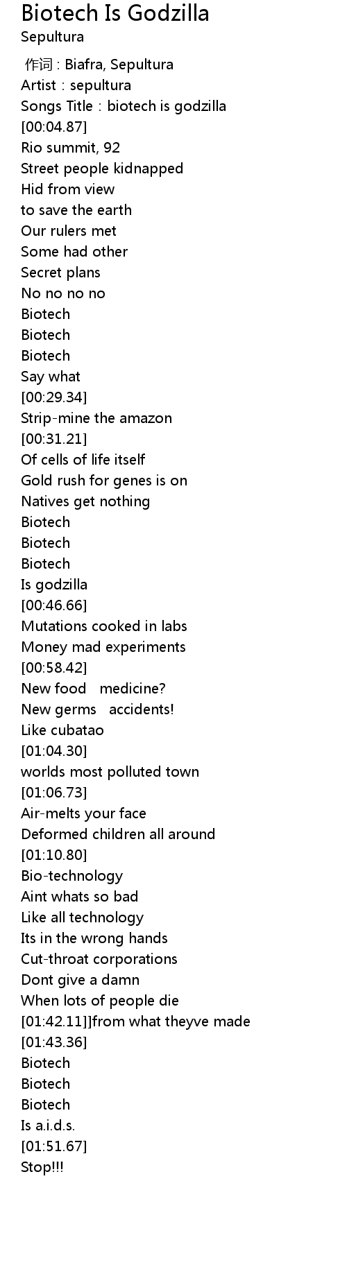 | [00:01.80] | Songs Title:biotech is godzilla |