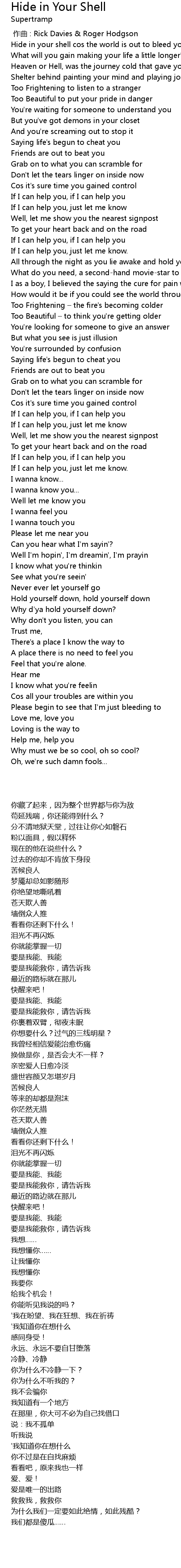 | [00:16.140] | Hide in your shell cos the world is out to bleed you for a ride |
