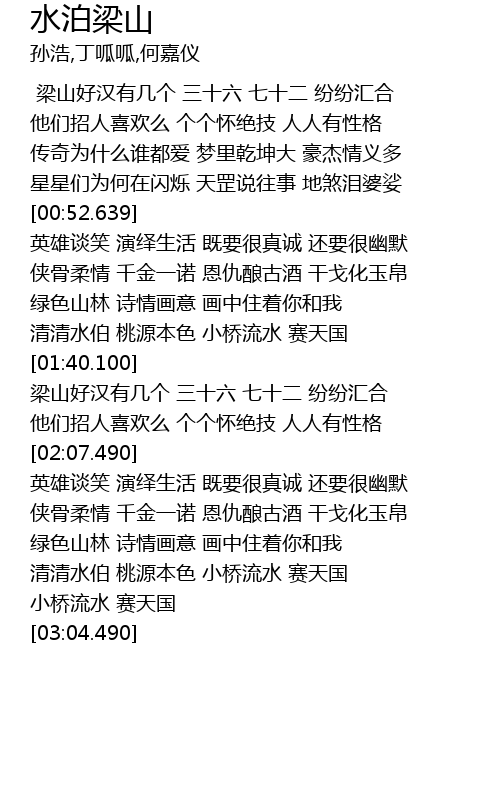 | [00:10.860] | 梁山好汉有几个 三十六 七十二 纷纷汇合 |