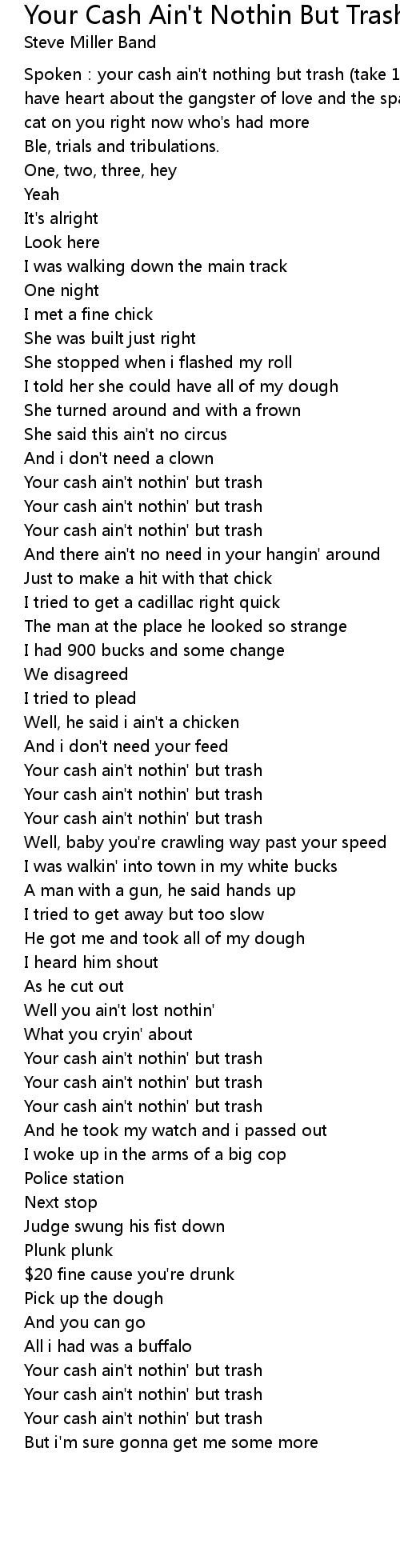 | Spoken: your cash ain' t nothing but trash take 1. here we go. yeah, you may have heart about the gangster of love and the space cowboy, but i' m gonna whip a cat on you right now who' s had more | |