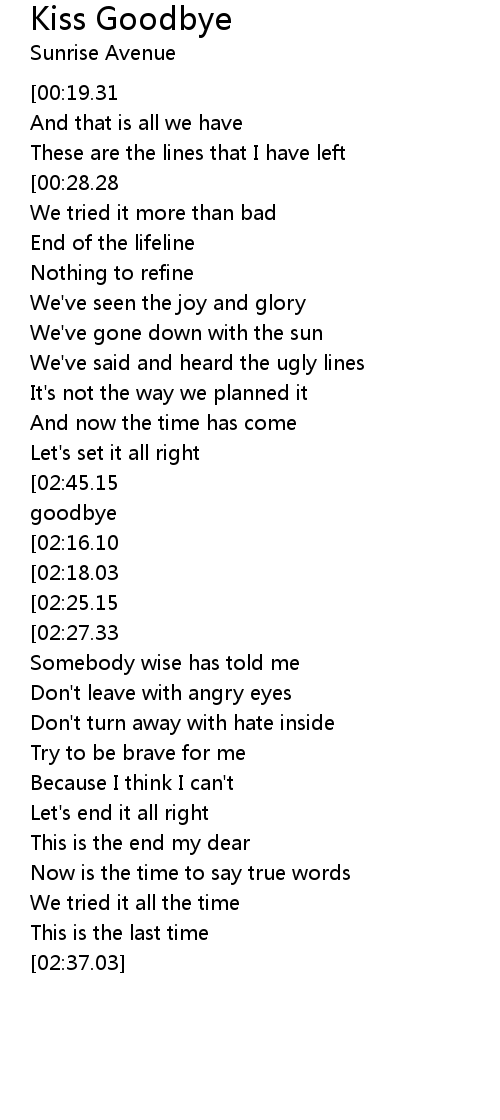 [03:07.48][02:45.15][02:30.93][02:08.62][01:13.21][00:53.21] It's time to kiss goodbye