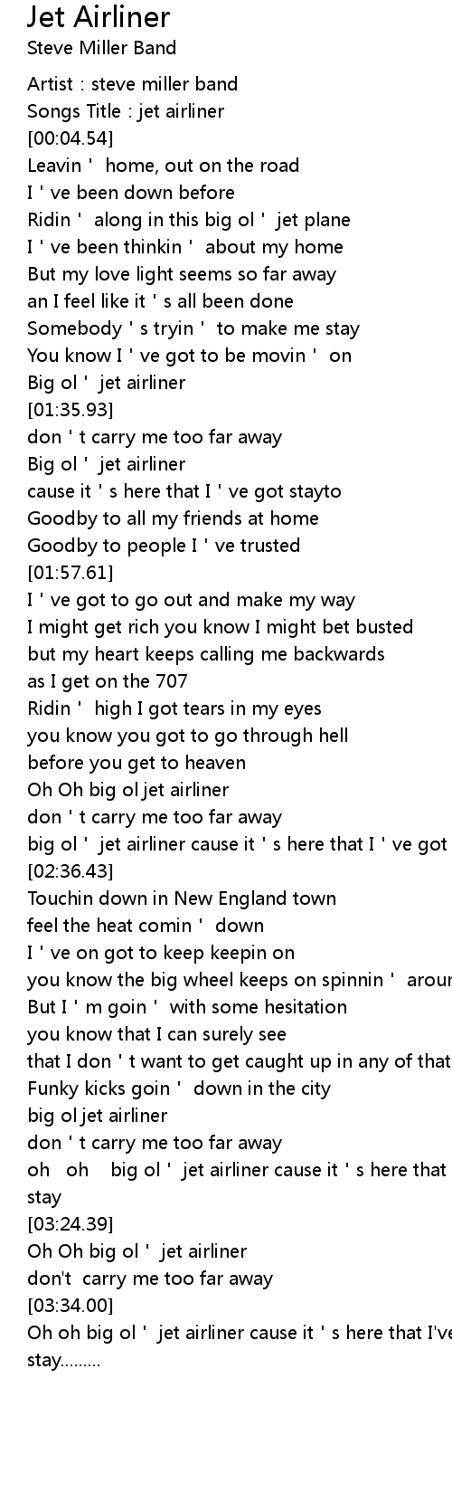 | [03:34.84] | Oh oh big ol' jet airliner cause it's here that I've got to stay......... |