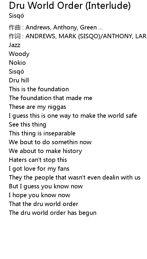| 作词 : ANDREWS, MARK (SISQO)/ANTHONY, LARRY JR/GREEN, JAMES E/RUFFIN, TAMIR | |