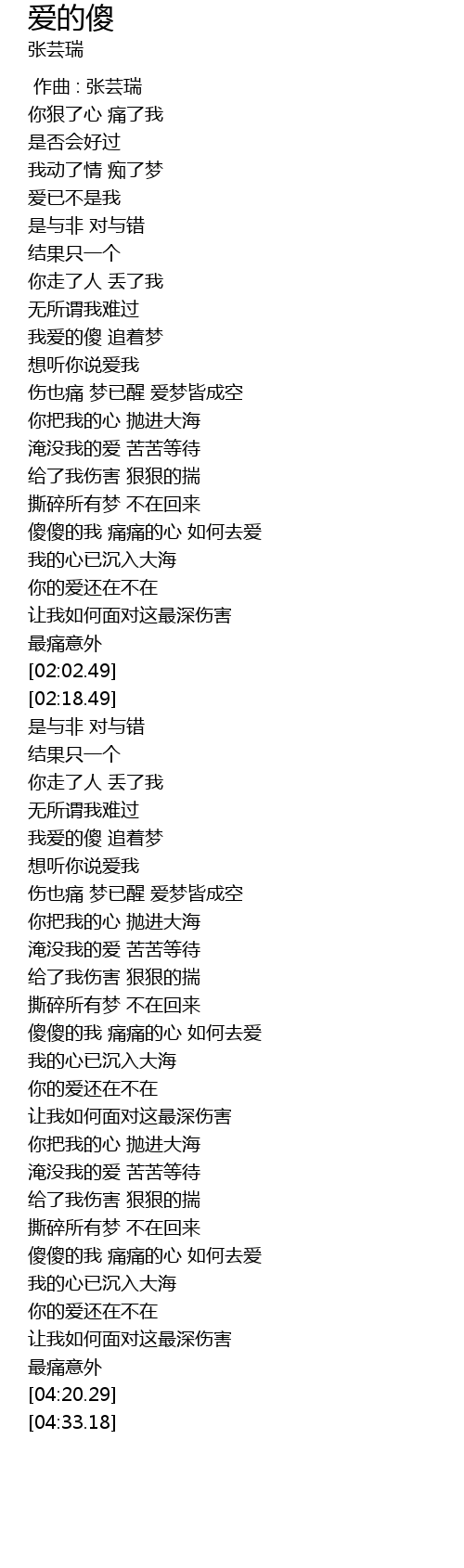 | [01:33.87] | 傻傻的我 痛痛的心 如何去爱 |