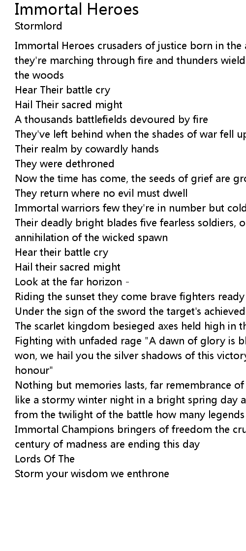 Immortal Heroes crusaders of justice born in the abyss brothers of steel unite they're marching through fire and thunders wielding with proudness the sword of the woods |