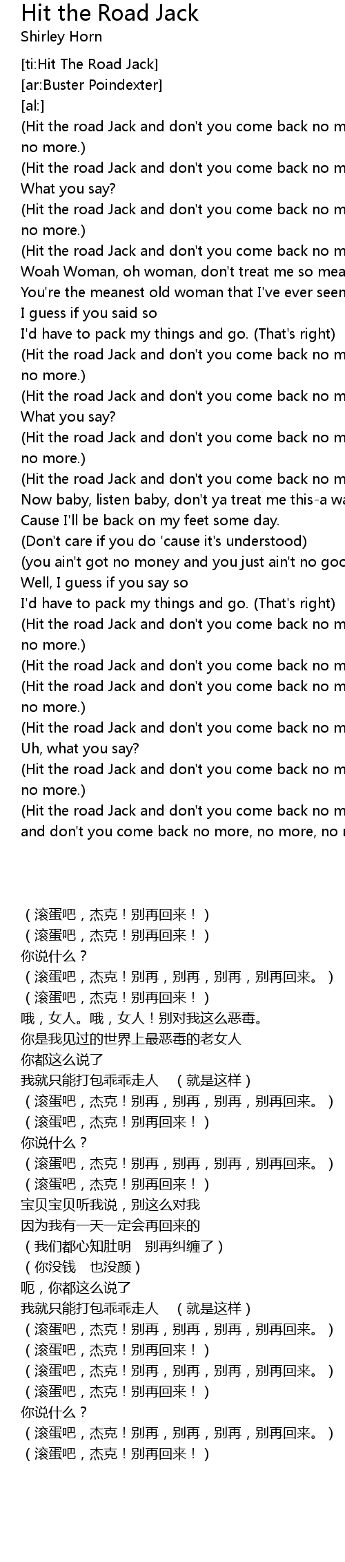 [02:25.86] (Hit the road Jack and don't you come back no more.)(Hit the road Jack and don't you come back no more, no more, no more, no more.)