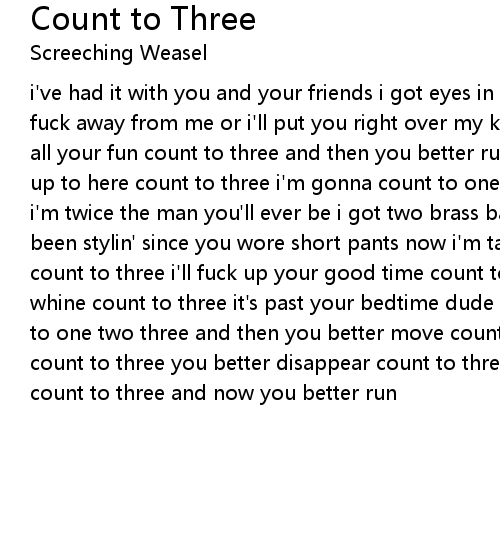 i've had it with you and your friends i got eyes in the back of my head get the fuck away from me or i'll put you right over my knee count to three i'll ruin all your fun count to three and then you better run count to three i've had it up to here count to three i'm gonna count to one two three you better disappear i'm twice the man you'll ever be i got two brass balls to prove it baby i've been stylin' since you wore short pants now i'm taking names and kicking ass count to three i'll fuck up your good time count to three and listen to you whine count to three it's past your bedtime dude count to three i'm gonna count to one two three and then you better move count to three i've had it up to here count to three you better disappear count to three i'll fuck up all your fun count to three and now you better run |