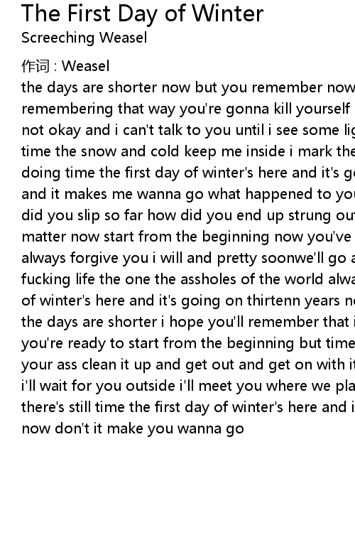 | the days are shorter now but you remember now i just wish that you weren' t remembering that way you' re gonna kill yourself everything is gray everything is not okay and i can' t talk to you until i see some light and that could take some time the snow and cold keep me inside i mark the days off on my calender i' m doing time the first day of winter' s here and it' s going on thirteen years now and it makes me wanna go what happened to you you used to be so beautiful how did you slip so far how did you end up strung out after all this time it doesn' t matter now start from the beginning now you' ve got another chance and i' ll always forgive you i will and pretty soonwe' ll go and don' t you hate that fucking life the one the assholes of the world always romanticize the first day of winter' s here and it' s going on thirtenn years now don' t it make you wanna go the days are shorter i hope you' ll remember that i' ll always be there whenever you' re ready to start from the beginning but time is moving fast time to get off your ass clean it up and get out and get on with it now and keep on trying and i' ll wait for you outside i' ll meet you where we planned and we' ll keep moving there' s still time the first day of winter' s here and it going on thirteen years now don' t it make you wanna go |