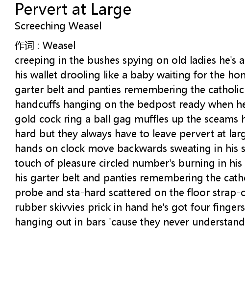 | creeping in the bushes spying on old ladies he' s a trembling psycho fingering his wallet drooling like a baby waiting for the homos prancing all around in his garter belt and panties remembering the catholic schoolgirls rope and leather handcuffs hanging on the bedpost ready when he' s home from work nipple clamps a gold cock ring a ball gag muffles up the sceams he brings them home he tries so hard but they always have to leave pervert at large sitting counting numbers hands on clock move backwards sweating in his suit and tie magazine is open touch of pleasure circled number' s burning in his mind crawling all around in his garter belt and panties remembering the catholic schoolgirls quearts of probe and stahard scattered on the floor strapon dildos on the windowsill rubber skivvies prick in hand he' s got four fingers up his ass he' s sick of hanging out in bars ' cause they never understand pervert at large |