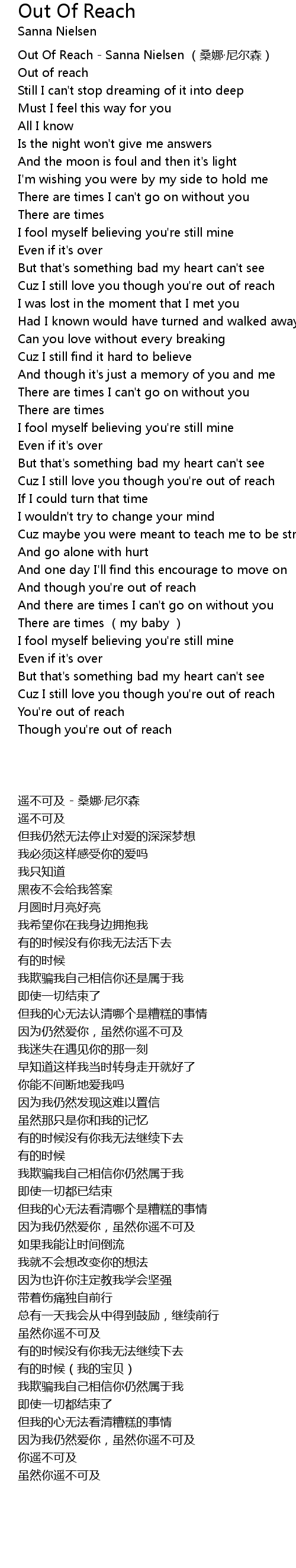 | [00:00.851] | Out Of Reach - Sanna Nielsen (桑娜·尼尔森) |