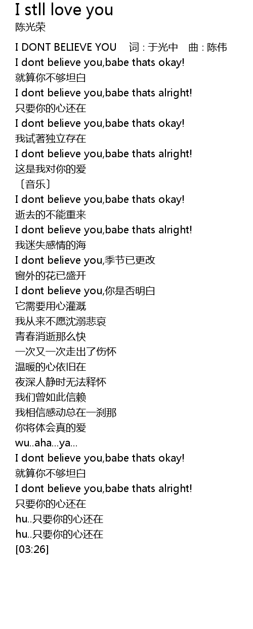 | [00:00] | I DONT BELIEVE YOU 词∶于光中 曲∶陈伟 |