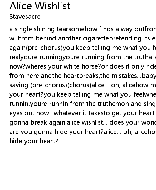 a single shining tearsomehow finds a way outfrom behind a wall of stubborn willfrom behind another cigarettepretending its endedlong enough to start it again(pre-chorus)you keep telling me what you feelwhen i ask you what is realyoure runningyoure running from the truthalice wishlist...so who you saving now?wheres your white horse?or does it only ride for you in wonderland?far away from here andthe heartbreaks,the mistakes...baby, youre the one that needs the saving.(pre-chorus)(chorus)alice... oh, alicehow much longer are you gonna hide your heart?you keep telling me what you feelwhen i ask you what is real.youre runnin,youre runnin from the truthcmon and sing your sad songs, babycry your eyes out now -whatever it takesto get your heart to a placewhere its not just gonna break again.alice wishlist... does your wonderland exist?how much longer are you gonna hide your heart?alice... oh, alicehow much longer are you gonna hide your heart? |
