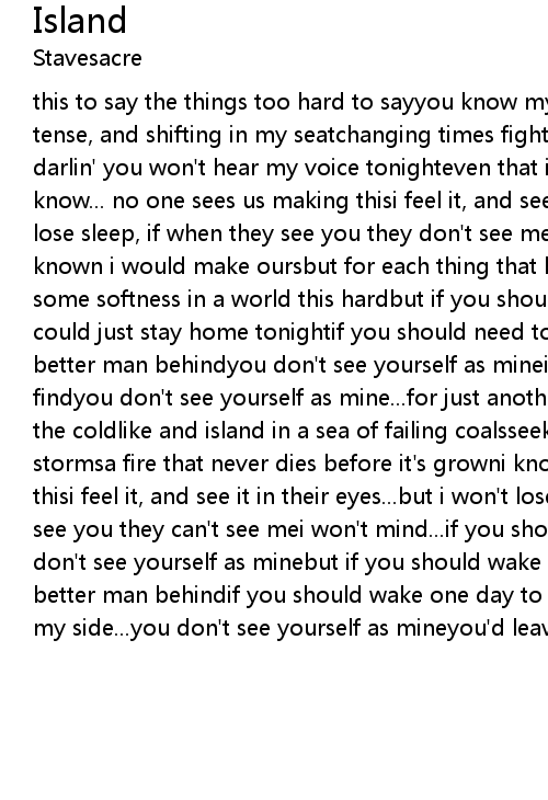 this to say the things too hard to sayyou know my wayit's just my wayrestless, tense, and shifting in my seatchanging times fight bottom lines fight dreamsand darlin' you won't hear my voice tonighteven that is held just out of reachi know... no one sees us making thisi feel it, and see it in their eyesbut i won't lose sleep, if when they see you they don't see mei won't mindall i've seen and known i would make oursbut for each thing that blesses, more leave scarsi found some softness in a world this hardbut if you should wake one day to findbaby, we could just stay home tonightif you should need to leave my sideyou'd leave a better man behindyou don't see yourself as mineif you should wake one day to findyou don't see yourself as mine...for just another soul that's come in from the coldlike and island in a sea of failing coalsseeking shelter from the coming stormsa fire that never dies before it's growni know, that no one sees us making thisi feel it, and see it in their eyes...but i won't lose sleep, if when they see you they can't see mei won't mind...if you should need to leave my sideyou don't see yourself as minebut if you should wake one day to findyou'd leave a better man behindif you should wake one day to findif you should need to leave my side...you don't see yourself as mineyou'd leave a better man behind