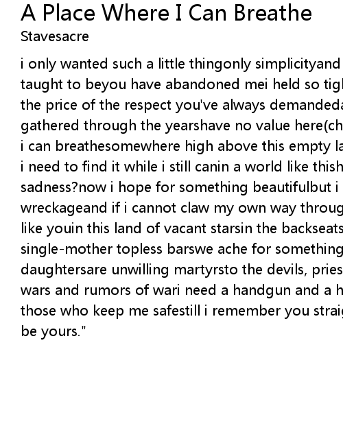 i only wanted such a little thingonly simplicityand now that i am who i was taught to beyou have abandoned mei held so tightly to every word you saidthat's the price of the respect you've always demandedand all those things i've gathered through the yearshave no value here(chorus)i need to find a place where i can breathesomewhere high above this empty landscapewhere the air is clearand i need to find it while i still canin a world like thishow can you wonder at my sadness?now i hope for something beautifulbut i feel trapped under your waves of wreckageand if i cannot claw my own way throughi fear one day i will be just like youin this land of vacant starsin the backseats of desperate carsin single-mother topless barswe ache for something moreyour sons and your daughtersare unwilling martyrsto the devils, priests, and other thievesand their wars and rumors of wari need a handgun and a hand grenadeto protect me from those who keep me safestill i remember you straight face:"Some day this will all be yours." |
