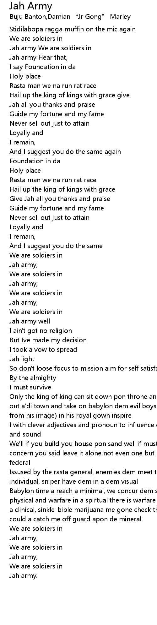 Babylon time a reach a minimal, we concur dem subliminal there is warfare in a physical and warfare in a spirtual there is warfare in a digital, and warfare in a clinical, sinkle-bible marijuana me gone check the rasta medical dem think dem could a catch me off guard apon de mineral |