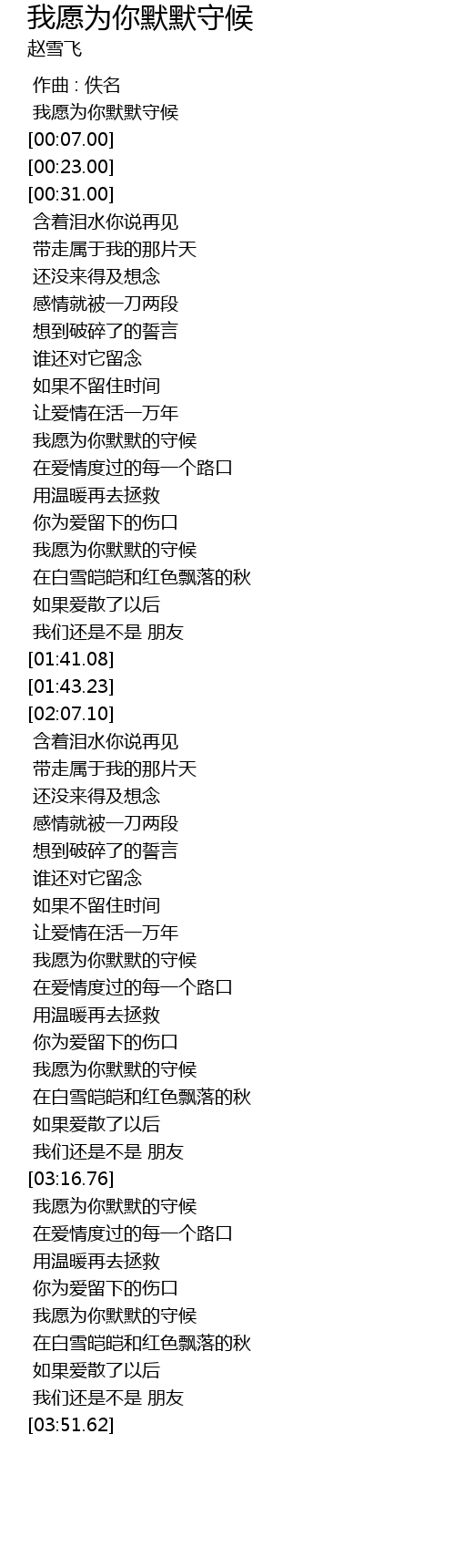 | [00:00.00] | wǒ yuàn wèi nǐ mò mò shǒu hòu |