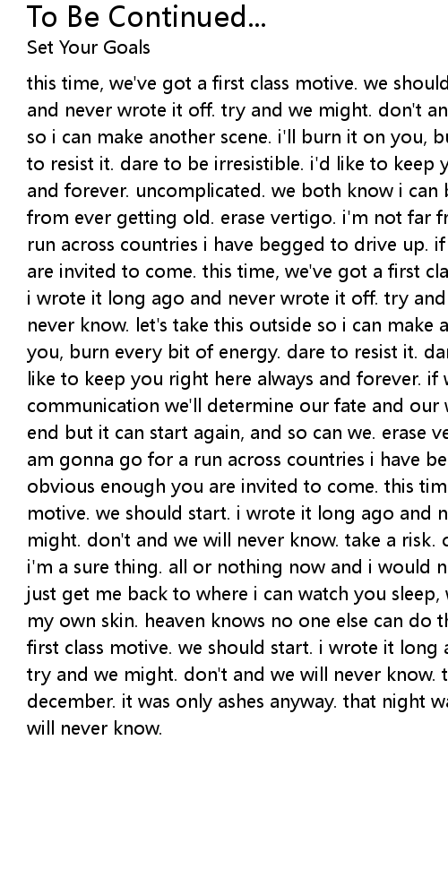 this time, we've got a first class motive. we should start. i wrote it long ago and never wrote it off. try and we might. don't and... let's take this outside so i can make another scene. i'll burn it on you, burn every bit of energy. dare to resist it. dare to be irresistible. i'd like to keep you right here always and forever. uncomplicated. we both know i can be unpredictable. i'll keep this from ever getting old. erase vertigo. i'm not far from home. i am gonna go for a run across countries i have begged to drive up. if it wasn't obvious enough you are invited to come. this time, we've got a first class motive. we should start. i wrote it long ago and never wrote it off. try and we might. don't and we will never know. let's take this outside so i can make another scene. i'll burn it on you, burn every bit of energy. dare to resist it. dare to be irresistible. i'd like to keep you right here always and forever. if we can keep on the communication we'll determine our fate and our whole situation. this song will end but it can start again, and so can we. erase vertigo. don't be so careful. i am gonna go for a run across countries i have begged to drive up. if it wasn't obvious enough you are invited to come. this time, we've got a first class motive. we should start. i wrote it long ago and never wrote it off. try and we might. don't and we will never know. take a risk. come take it on me. believe i'm a sure thing. all or nothing now and i would not trade you for anything. just get me back to where i can watch you sleep, where i can feel comfortable in my own skin. heaven knows no one else can do that for me. this time, we've got a first class motive. we should start. i wrote it long ago and never wrote it off. try and we might. don't and we will never know. try and we might. don't forget december. it was only ashes anyway. that night was me and the moon. don't and we will never know. |
