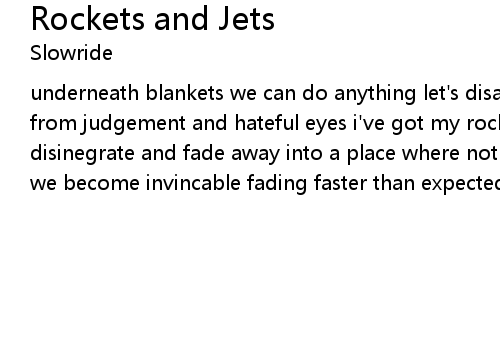 | underneath blankets we can do anything let's disappear - far from our peers free from judgement and hateful eyes i've got my rockets and i've got my jets disinegrate and fade away into a place where nothing exists in growing invisable we become invincable fading faster than expected |