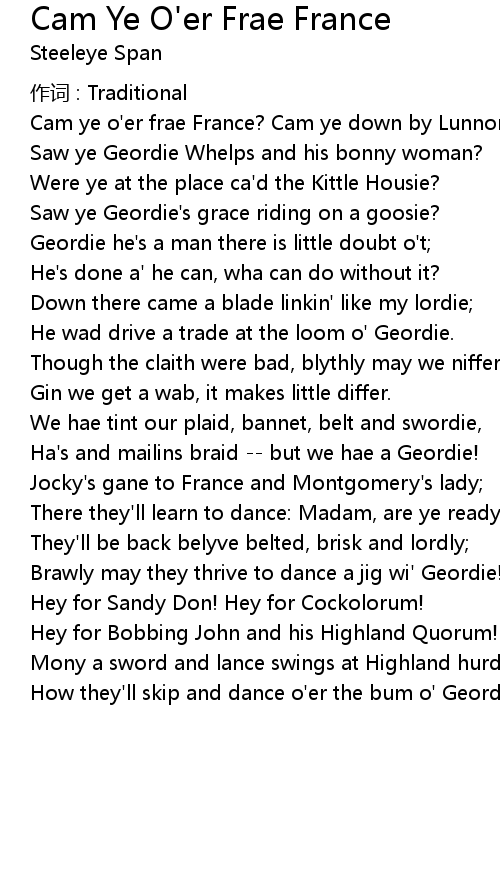 | Cam ye o' er frae France? Cam ye down by Lunnon? | |