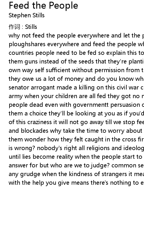 | why not feed the people everywhere and let the peace begin? turn your swords to ploughshares everywhere and feed the people when they borrow in third world countries people need to be fed so explain this to politicians while we send them guns instead of the seeds that they' re planting in the ground making their own way self sufficient without permission from the good old usa but it seems they owe us a lot of money and do you know what for? cause the friends of senator arrogant made a killing on this civil war chorus it is hard to raise an army when your children are all fed they got no motivation for making other people dead even with governmentt persuasion of the most compelling kind give them a choice they' ll be looking at you as if you' d lost your mind but then all of this craziness it will not go away till we stop feeding hatred with embargoes and blockades why take the time to worry about anybody else? maybe talk about them wonder how they felt caught in the cross fire of someone else' s fight what is wrong? nobody' s right all religions and ideologies suffer from the truth until lies become reality when the people start to shoot got a whole lot to answer for but who are we to judge? common sense and enough to eat can settle any grudge when the kindness of strangers it means no disrespect being honest with the help you give means there' s nothing to expect chorus |
