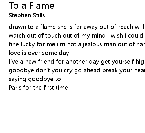 | drawn to a flame she is far away out of reach will she burn her wings i can only watch out of touch out of my mind i wish i could tell if she's all right feeling fine lucky for me i'm not a jealous man out of hand out of my mind when this love is over some day | |