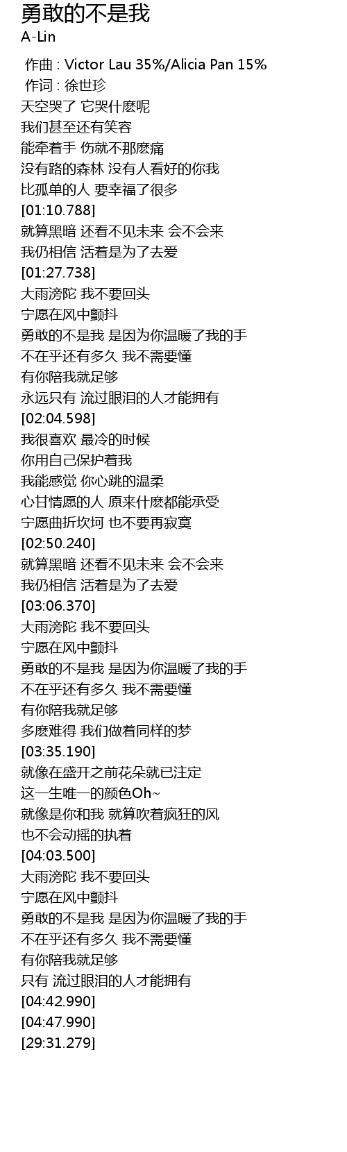 | [01:38.369] | 勇敢的不是我 是因为你温暖了我的手 |