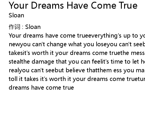 | Your dreams have come trueeverything' s up to youbut you can turn into someone newyou can' t change what you loseyou can' t seebut blieve thatthe toll it takesit' s worth it your dreams come truethe mess you makethat sense of hope you stealthe damage that you can feelit' s time to let healcan turn into something realyou can' t seebut believe thatthem ess you makeyour dreams have come truethe toll it takes it' s worth it your dreams come trueturned into something newyour dreams have come true |