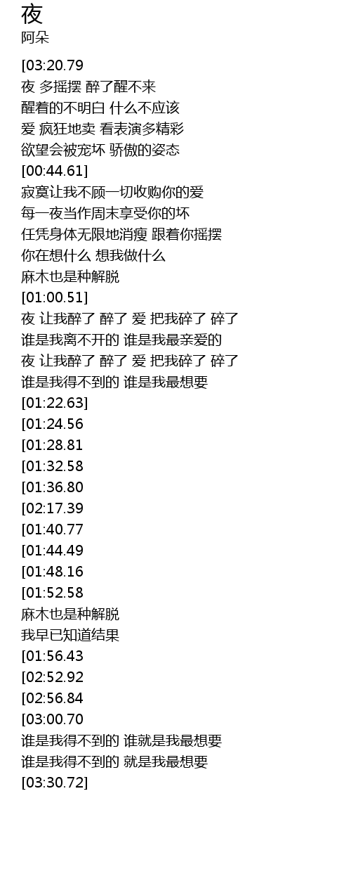| [02:20.54][01:24.56] | 夜 多摇摆 对准我的节拍 |