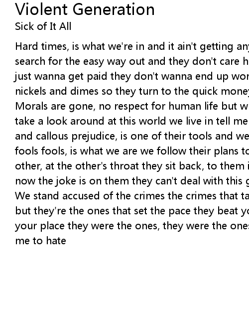 Morals are gone, no respect for human life but what was it that you'd expect take a look around at this world we live in tell me you wouldn't grow up cold and callous prejudice, is one of their tools and we fell for it like a pack of fools fools, is what we are we follow their plans to the letter so far each other, at the other's throat they sit back, to them it's all a joke joke, but now the joke is on them they can't deal with this generation so violent |