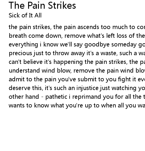 the pain strikes, the pain ascends too much to comprehend come down, remove the breath come down, remove what's left loss of the will to live, the loss of everything i know we'll say goodbye someday goodbye said in an eternal way too precious just to throw away it's a waste, such a waste, what a waste, you know i can't believe it's happening the pain strikes, the pain's at hand too much to understand wind blow, remove the pain wind blow, put out the flame you won't admit to the pain you've submit to you fight it every inch of the way you don't deserve this, it's such an injustice just watching you slip away you on the other hand - pathetic i reprimand you for all the things you believe nobody wants to know what you're up to when all you want to do is deceive |